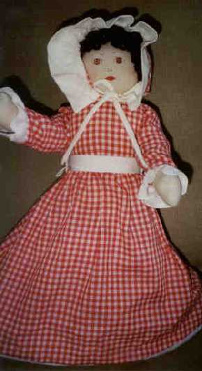 This special Topsy-Turvy Doll was sent by Clarksburg Elementary School to Japan. American cloth dolls have a certain charm that is all their own. In the early days of this country, they were often a child's first toy -- cuddly and soft. Many designs were made by mothers for their children. "Topsy-Turvy" or "Two-in-One" dolls first appeared in the South in the 1800s. It is widely believed that they were made by servants, sewn from saved dress scraps. Mothers likely made these dolls for their children as well. Though a very popular style, sadly few of these well-loved dolls have survived over time. This is a handmade, hand-painted reproduction doll. |