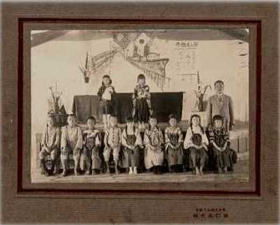 The United States and Japan exchanged dolls in 1927 for the purpose of friendship. A Blue-eyed Doll also came to Taihei Elementary School. Hung up above the stage are the words, "We all welcome you." Now only the photo remains. The girls appear in Japanese-style pleated skirts. There are also children who are wearing tabi socks. Many of the boys are dressed in Western clothes. |