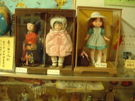 | The Blue-eyed Doll "Mary Jane" was sent by the American Dr. Gulick in 1927. During the war, people at other schools stabbed, burned with fire, and threw into the sea the dolls that had been received from America. However, the people at Tobe Elementary School kept their Blue-eyed Doll with great care. Therefore, Mary Jane is at Tobe Elementary. After the war ended, the Blue-eyed Doll "Karen" was sent by Mr. Gulick, 3d, the grandson of Dr. Gulick. To show our thanks we sent "Misao" to him from Tobe Elementary. | ![]() |