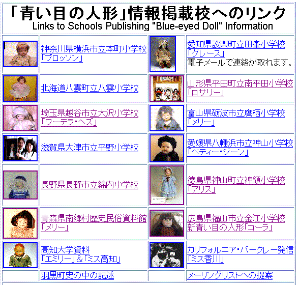 By 1996, among the schools participating in the 100-School Project, it was confirmed that there was a "Blue-eyed Doll Page" at the two schools of Yokohama City's Honcho Elementary School in Kanagawa Prefecture and Otsu City's Hirano Elementary School in Shiga Prefecture. Also, we were able to connect by e-mail to the individually-created pages at Koshiya City's Osawa Elementary School in Saitama Prefecture and Shitara Town's Damine Elementary School in Aichi Prefecture, so we reached the point of creating a Blue-eyed Doll linked network.